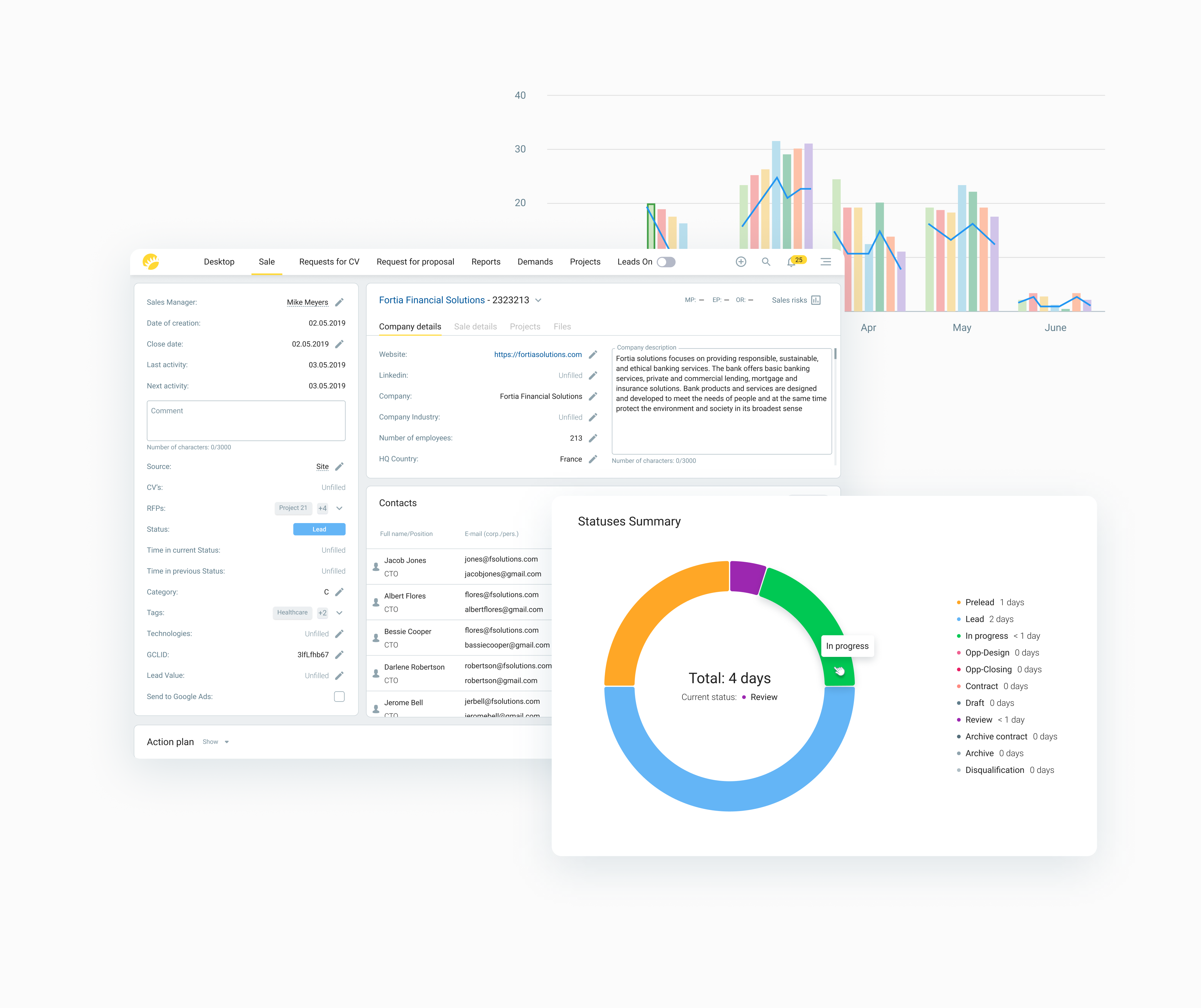 Andersen CRM is system for the optimization of the company's business processes. The CRM system is designed for the effective management of the sales cycle by internal staff members (Sales managers, Sales assistants, HRs, Delivery Directors, PMs).